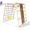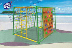 Quy cách: Khung và 3 thang leo bằng thép sơn tĩnh điện. Thang leo dây bằng dây cáp các mấu giao cố định vị trí. Có vách leo núi gỗ, các mấu leo bằng nhựa. Có xích đu và xà đu thể lực