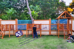 Quy cách: Nhà chơi liên hoàn cầu trượt làm bằng chất liệu gỗ gồm: 01 khối nhà có mái, 01 khối nhà không mái, 01 khối hình lục giá, 02 cầu nối thang dây có các bậc bằng gỗ . 02 cầu trượt thẳng, 02 thang leo. lan can bảo vệ.