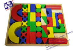 Bằng gỗ sơn màu, bề mặt phẳng, không sắc cạnh, đảm bảo tiêu chuẩn an toàn. Gồm 51 chi tiết: khối trụ, khối tam giác, khối hình vuông, khối chữ nhật, khối chữ nhật khuyết cầu, khối bán nguyệt khuyết cầu, khối chữ X.