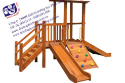Nhà chơi liên hoàn cầu trượt làm bằng chất liệu gỗ gồm: 01 khối nhà kép mái trang trí mặt hề. 01 cầu trượt đôi, 01 cầu trượt đơn. 01 thang leo lên, 01 thang leo bò có mấu.