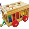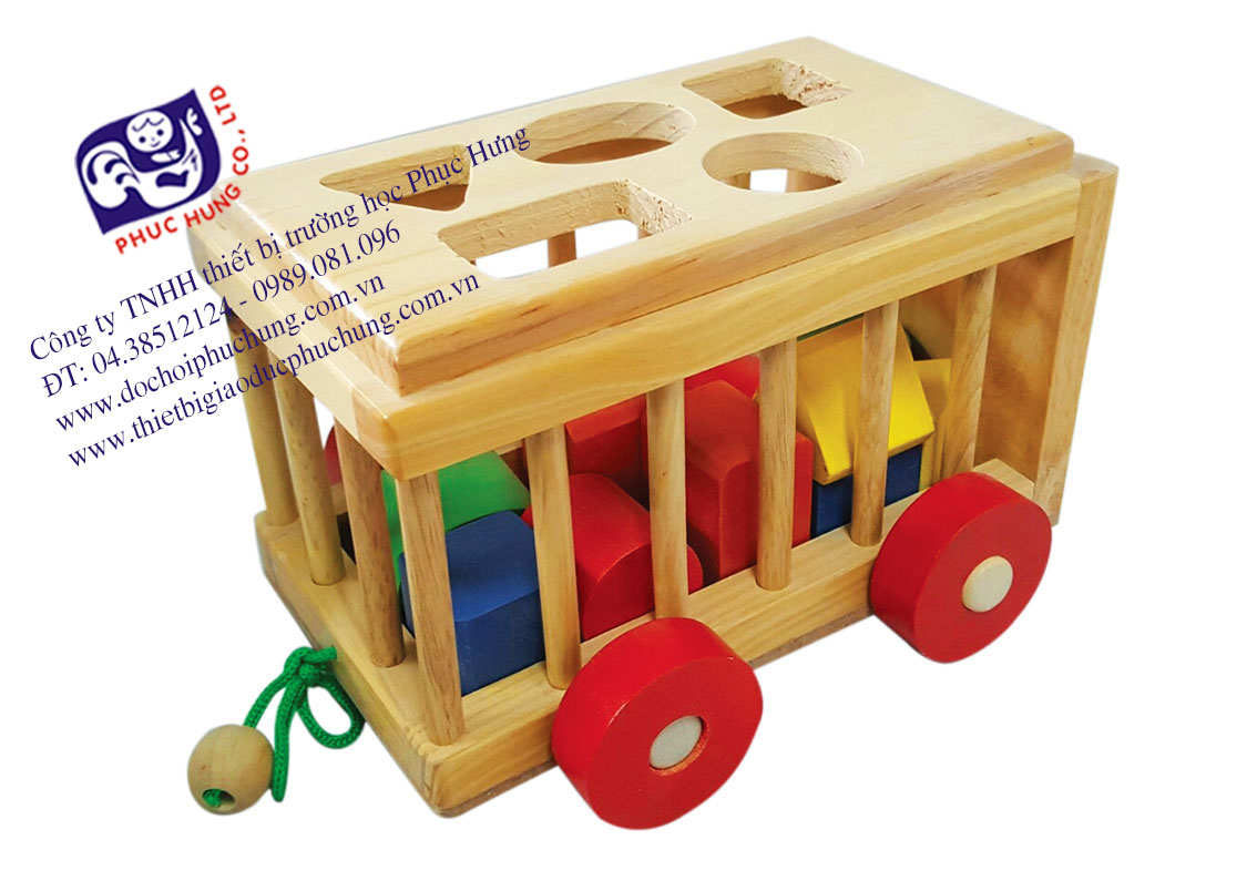 Vật liệu bằng gỗ đảm bảo tiêu chuẩn an toàn. Xe cũi có kích thước khoảng (190x130x125)mm, 4 bánh xe, đường kính nan cũi tối thiểu 10mm, có dây kéo. Mặt trên của xe có 5 lỗ hình học cơ bản (hình vuông, tam giác, tròn, chữ nhật và bán nguyệt) và các khối hình tương ứng để thả có tỉ lệ và kích thước tương ứng; các khối hình để thả được sơn mầu cơ bản và đảm bảo không thể thả lẫn các hình với nhau.