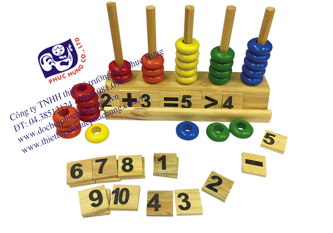 Gồm 5 cọc cao 115mm ĐK cọc 12mm. Mỗi cọc có 6 hạt tính bằng gỗ hoặc bằng nhựa, ĐK hạt 35mm dày 10mm gồm 6 hạt xanh lam, 6 hạt xanh cốm, 6 hạt vàng, 6 hạt đỏ, 6 hạt cam. Có bộ số từ 1 đến 10 mỗi số có số lượng là 2, kèm các dấu cộng (+), trừ (-), lớn hơn, nhỏ hơn (>, <) bằng (=). KT của miếng ghi số và dấu là 30x30mm.